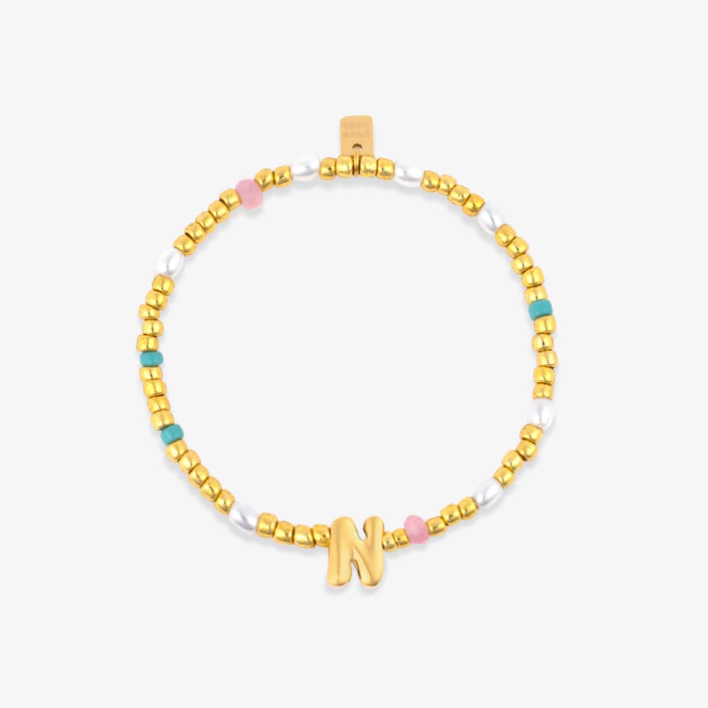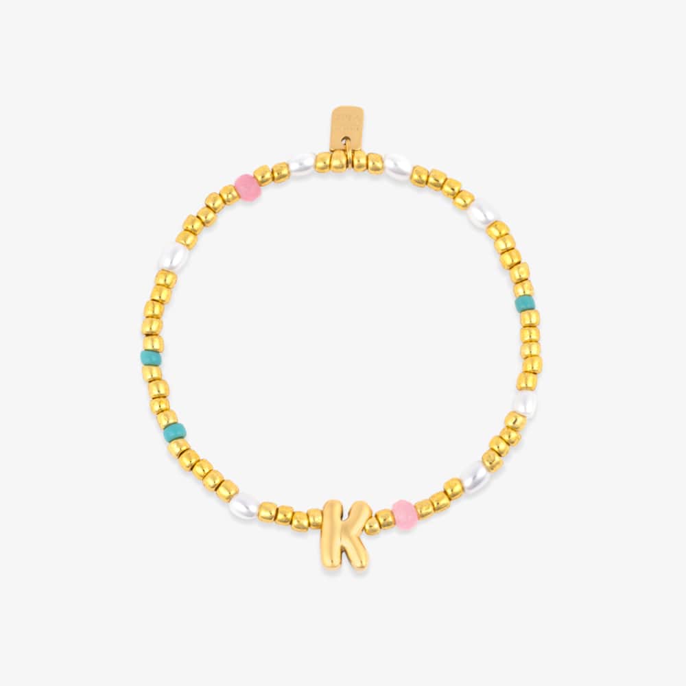 Your letter, your look. This stretchy, waterproof bracelet is strung with playful pearl beads, colorful seed beads, and a bold gold initial that’s all about you. Slip it on, stack it up, and let your style speak louder than words.
